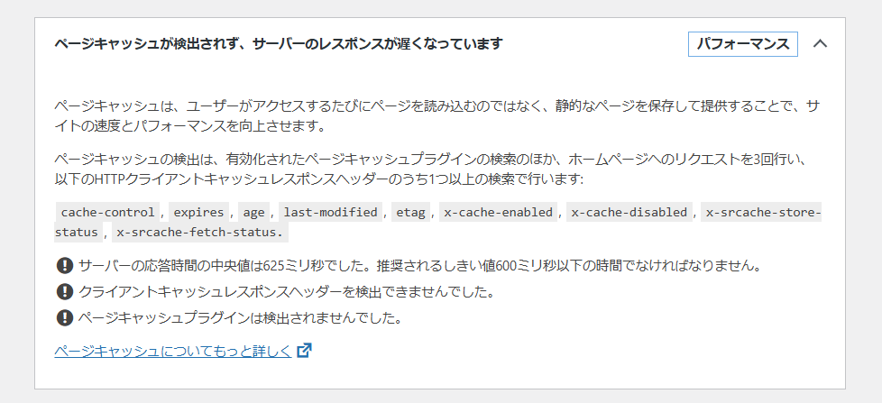 ページキャッシュが検出されず、サーバーのレスポンスが遅くなっています