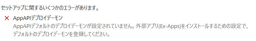 このエラーメッセージは、NextcloudのAppAPI機能が、外部アプリ(Ex-Apps)をデプロイ(展開)するための設定が行わえていないので、設定するようにとのメッセージです