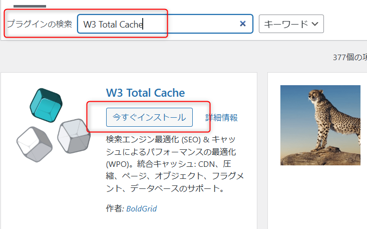 1.プラグインの追加で「W3 Total Cache」を検索してインストールします