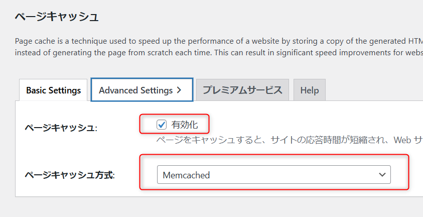 3.ページキャッシュ内で、ページキャッシュが「有効化」にチェックが入っている事を確認します