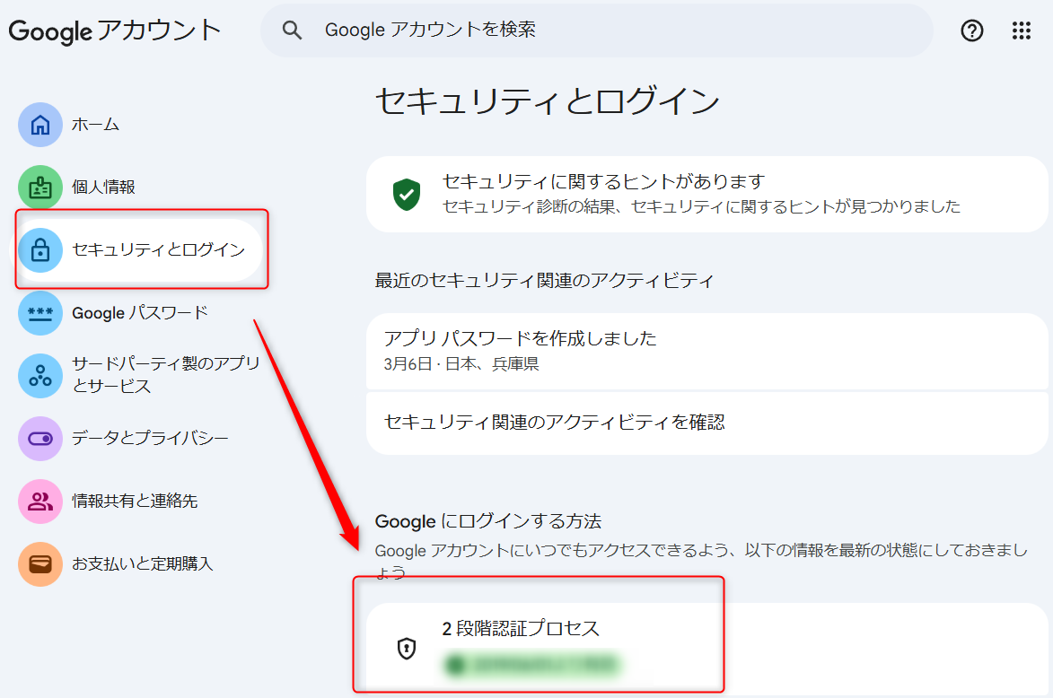 Googleアカウントの設定画面により2段階認証プロセスより設定できます。有効にしている方は設定不要です