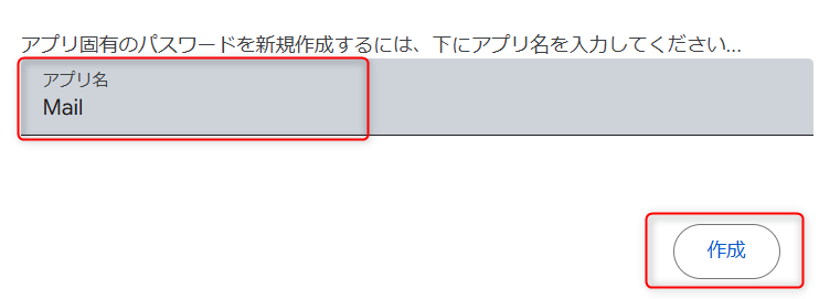 2.「アプリパスワード」の設定画面より「アプリ名」を入力して「作成」を選択します