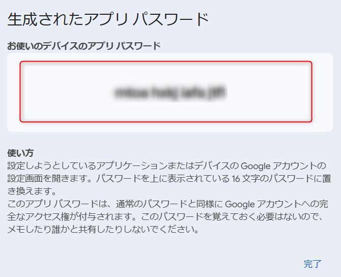 3.作成ボタンをクリックするとアプリパスワードが発行されます。パスワードは4文字ごとでスペースで区切られており16桁のパスワードです。